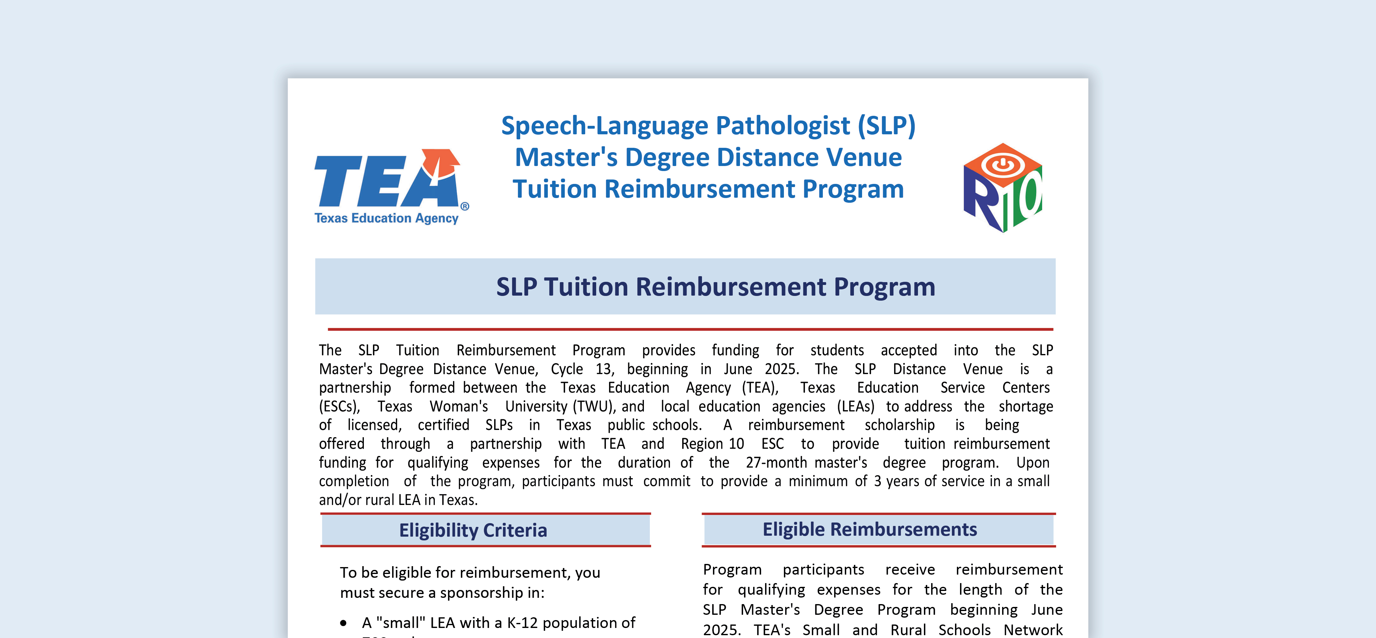 The speech-language pathologist Small and Rural Graduate Tuition provides financial support for students accepted into the Master’s in Speech-Language Pathology Distance Venue program at Texas Woman’s University (TWU). This Distance Venue is a collaborative effort between TEA, Education Service Centers (ESCs) 10 and 15, TWU, and Local Education Agencies (LEAs), designed to help address the shortage of licensed and certified SLPs in Texas public schools and charter schools.  Prior to receiving any monies towards tuition reimbursement, participants must commit to serving a minimum of three years in a small and/or rural school or a Shared Services Arrangement (SSA). Program participants receive reimbursement for qualifying expenses (i.e., tuition and fees, books, CALIPSO fee, dorm costs, food, materials, AVANT testing for bilingual certificate) for the length of the SLP Master's Degree Program.