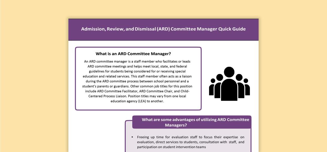 ARD Committee Manager Quick Guide ARD/IEP Supports, Child Find ShareBookmark this collection View Guide Overview of key roles and responsibilities of an ARD committee manager.
