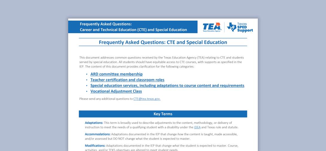 This document addresses common questions received by the Texas Education Agency (TEA) relating to CTE and students served by special education. All students should have equitable access to CTE courses, with supports as specified in the IEP. The content of this document provides clarification for the following categories: