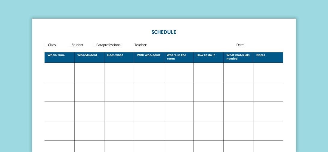 Classroom schedules help you see the big picture before focusing on individual student and staff schedules. Begin by putting in all the things you know, such as paraprofessional duty schedules, or student lunches and general education times, and then fill in the rest around that framework.