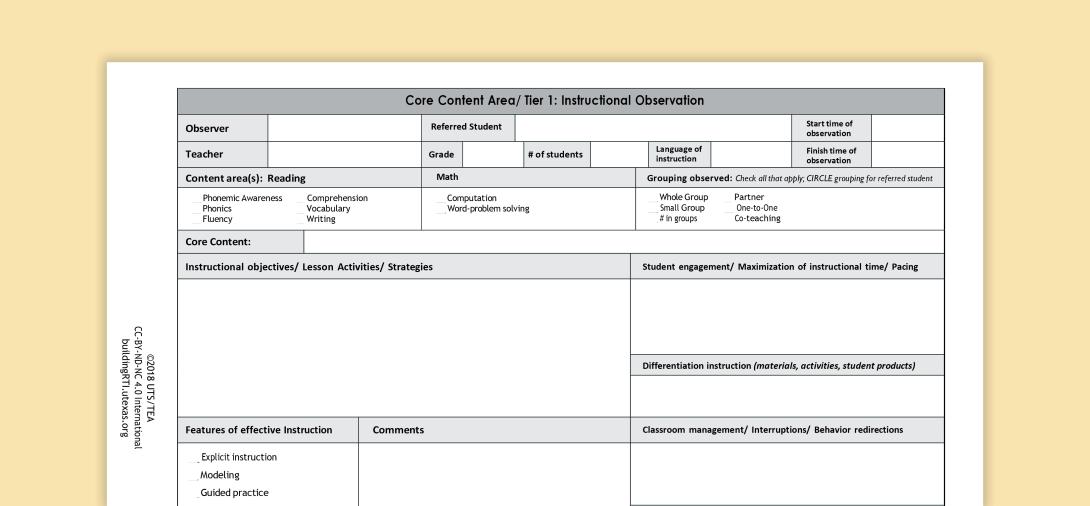 This Core Content Area/Tier 1: Instructional Observation form is for observing the student during general education instruction. The multidisciplinary team (MDT) may use this template or revise it to create a form tailored to gather information during a special education evaluation.