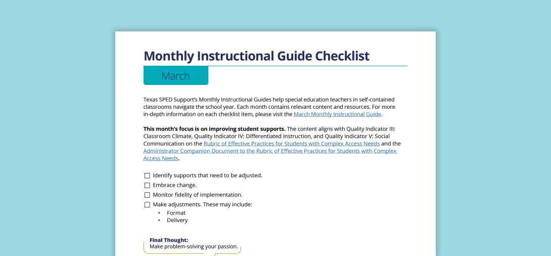 Texas SPED Support’s Monthly Instructional Guides help special education teachers in self-contained classrooms navigate the school year. Each month contains relevant content and resources.