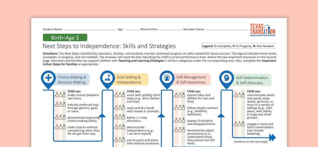 The Next Steps checklist can also serve as an informal transition assessment for self-determination skills. It is divided by age and grade ranges, starting with Birth to Age 3 and ending with 18+ (Ages 18-22), highlighting critical developmental milestones.