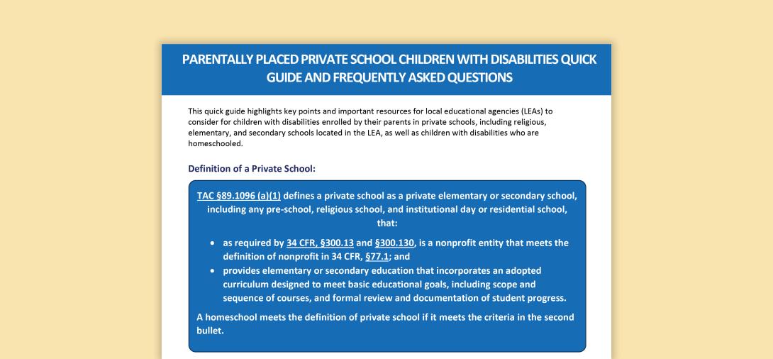 This quick guide highlights key points and important resources for local educational agencies (LEAs) to consider for children with disabilities enrolled by their parents in private schools, including religious, elementary, and secondary schools located in the LEA, as well as children with disabilities who are homeschooled.