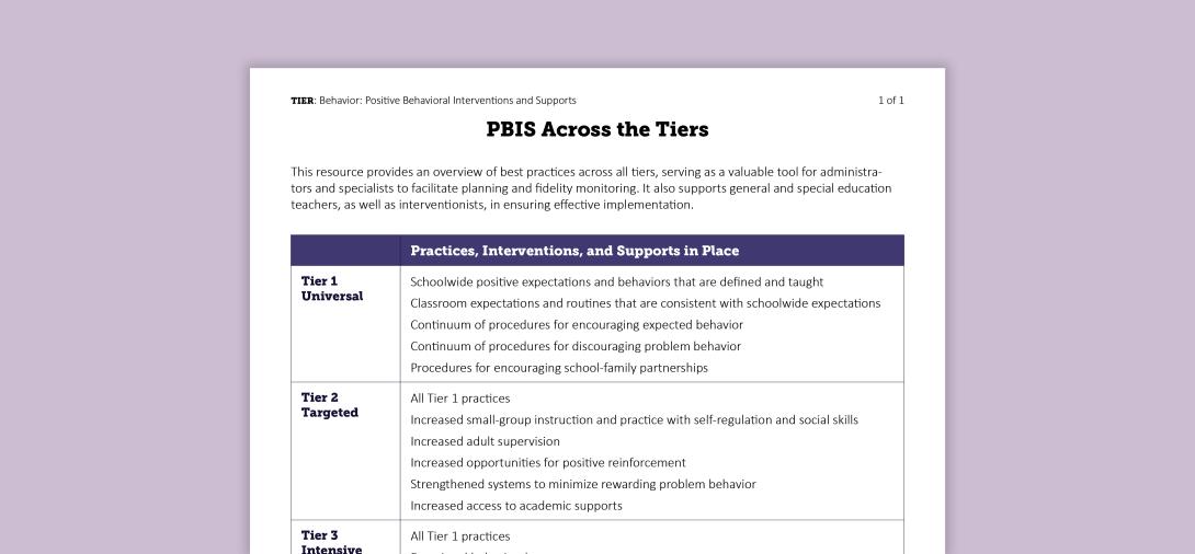 This resource provides an overview of best practices across all tiers in PBIS, serving as a valuable tool for administrators and specialists to facilitate planning and fidelity monitoring. It also supports general and special education teachers, as well as interventionists, in ensuring effective implementation.
