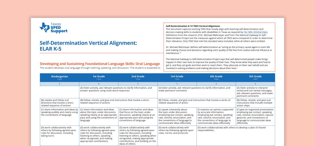 Self-determination skills aligned with the ELAR TEKS for elementary.