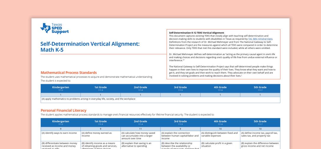 Educators may use this document to consider where self-determination skills are addressed in math TEKS for elementary school or to develop standards-based annual individualized education program (IEP) goals for a specific student.