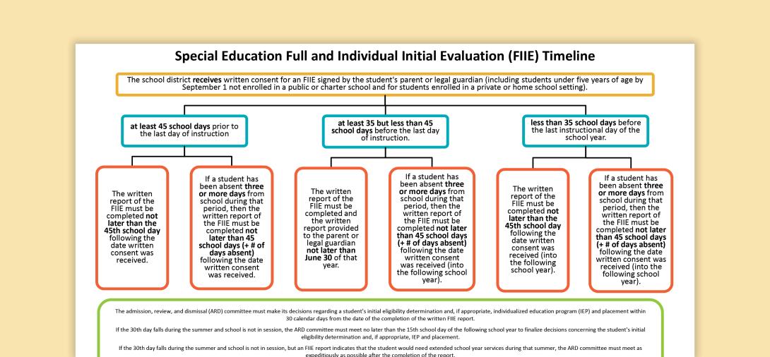 The Special Education Full and Individual Initial Evaluation (FIIE) Timeline provides an overview of the various timelines for an initial evaluation and ARD committee meetings where eligibility is determined based upon when the school district received written consent for an FIIE.