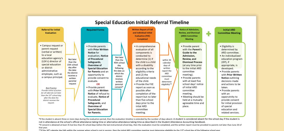 The Special Education Initial Referral Timeline provides an overview of the timeline and legal requirements for a referral for an initial special education evaluation from the point of campus or parent request for a referral for an initial evaluation to the initial ARD committee meeting where eligibility is determined, and may be another helpful resource for ensuring timelines and legal requirements are implemented.