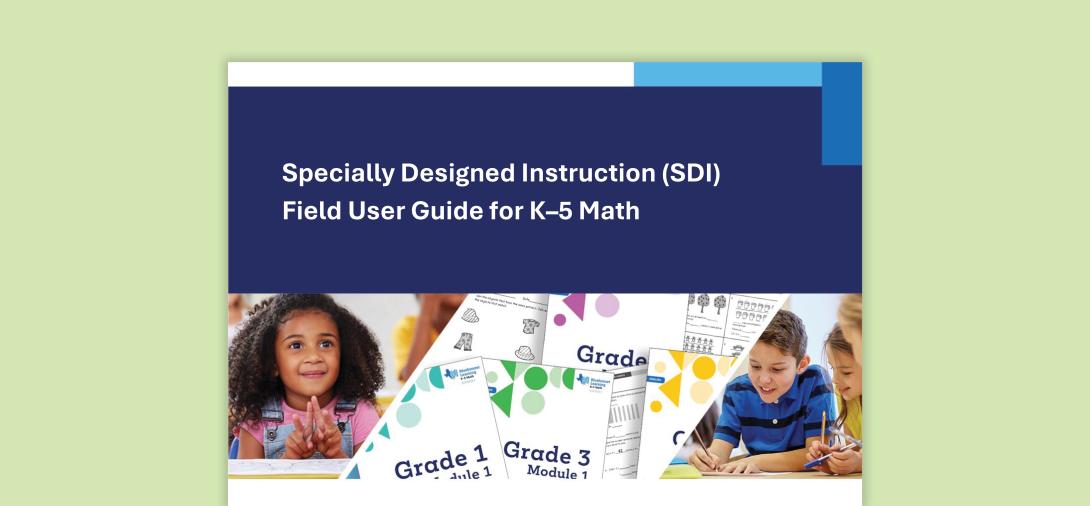 The Specially Designed Instruction (SDI) Field User Guide for K–5 Math is a comprehensive resource developed to help educators implement SDI for students receiving special education services within the Bluebonnet Learning K–5 Mathematics curriculum. Aligned with the Texas Essential Knowledge and Skills (TEKS) and federal Individuals with Disabilities Education Act (IDEA) regulations, the guide outlines how to adapt content, methodology, and instructional delivery to meet individual student needs.