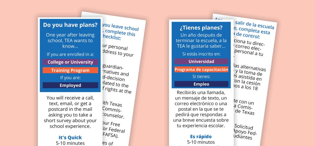To collect data related to post-school outcomes required for State Performance Plan Indicator (SPPI) 14, a survey is conducted one year after the exited students left public school. Local education agencies (LEAs) may print copies of this bookmark to share information about the survey with students and their parents/guardians before they exit public school.