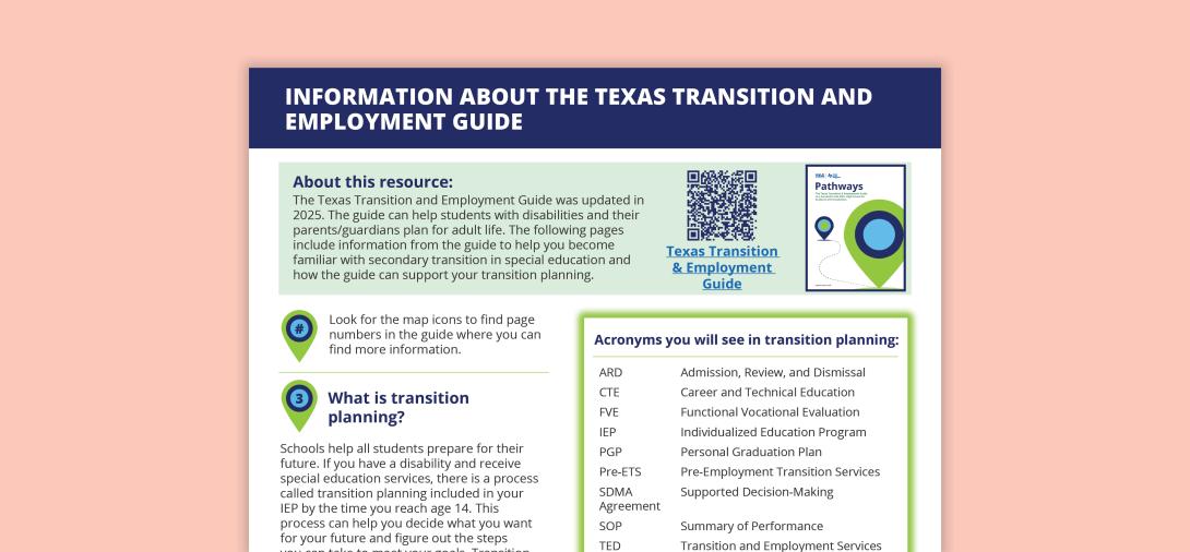This document provides an overview of secondary transition planning using excerpts from the Texas Transition and Employment Guide. Local educational agencies (LEAs) may use or adapt this resource to share written information about the guide with students and families, as required by Texas Education Code §29.0112(e)(2).