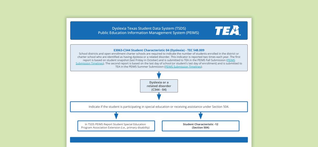 The Texas Student Data System (TSDS) Public Education Information Management System (PEIMS) Dyslexia document is a quick guide to the required descriptors that must be reported to TSDS PEIMS.